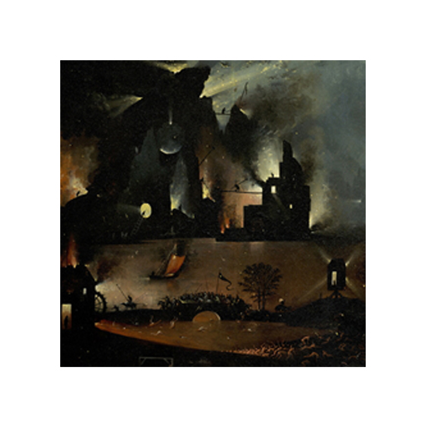 Como en un espejo invertido, la luz se ha convertido en tinieblas y el aire tibio en frialdad glacial. Los personajes, desnudos, tiritan de frío; tienen la piel azulada y hasta el agua aparece cubierta de hielo. El deleite se ha mudado en tormento y la música en ruido infernal. La ausencia de horizonte domina el espacio. No hay esperanza para los condenados. Perdido en una maraña de construcciones espectrales envueltas en llamas y humo negro, una diminuta figura asciende por la escalera celestial. Es el Creador, emergiendo de la morada de los muertos y elevándose hacia la salvación.