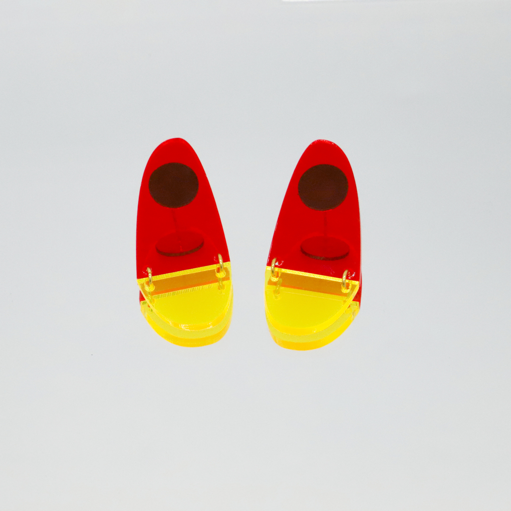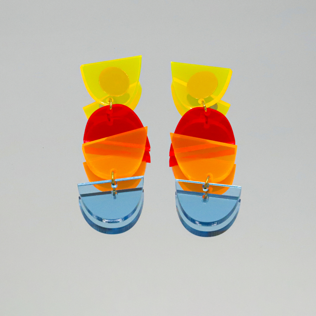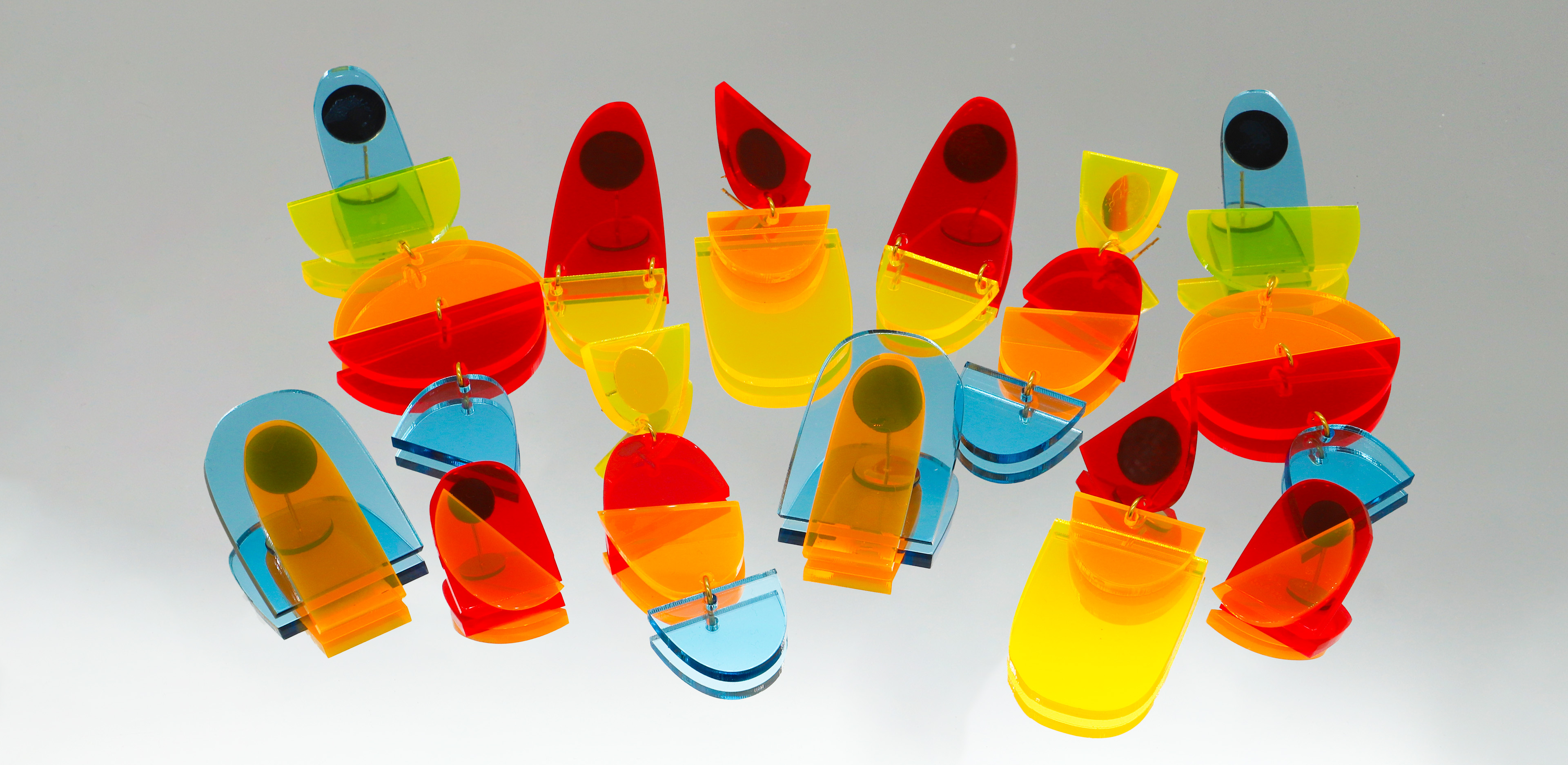 A burst of fluorescent acrylic revives the 80s vibe in six wearable mini sculptures. Coloured circuits in the form of earrings that capture ambient light and refract it into dancing sparkles.