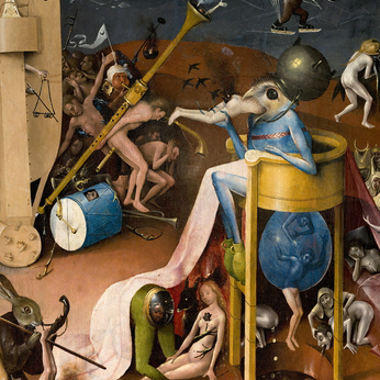 Violent chaos sweeps through the scene. Sitting on a throne, a blue-coloured monster with a bird’s head devours the damned to cast them into a dark pit. The large cauldron it holds over its head, similar to a globe, symbolises its voracious appetite. He is the Prince of Hell. At his feet, other sins are also punished, according to the implacable law of retribution: laziness, in the figure of the man lying in bed being dragged by a demon; gluttony, in the figure of the man condemned to vomit on his knees at the edge of the abyss; greed, in the figure of the miserable man forced to defecate his gold coins; arrogance, in the figure of the woman forced to see her reflection in the buttocks of a strange creature. And vanity, will vanity be punished for wearing these earrings?