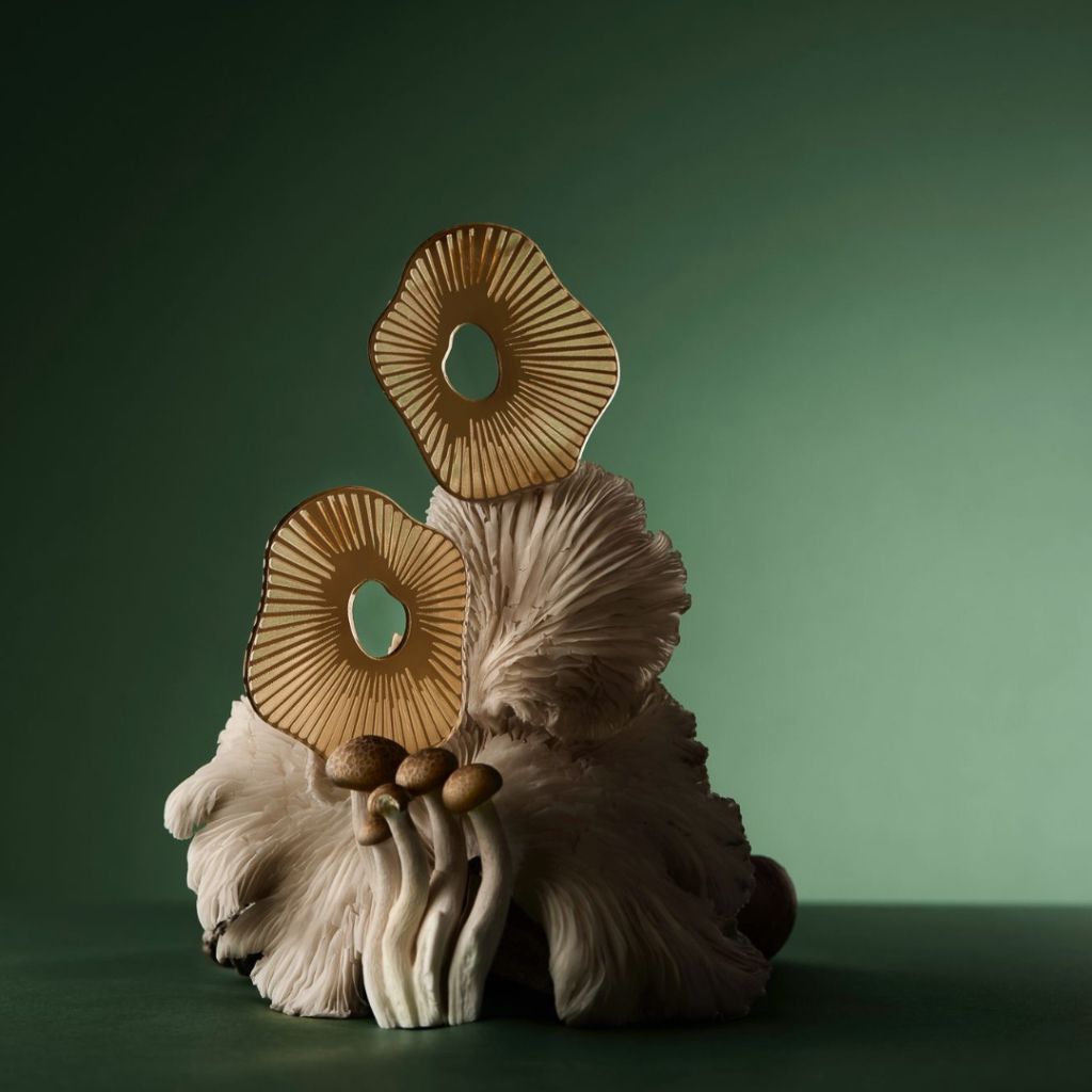 La capacidad de los hongos para dispersar esporas es asombrosa. Como suelen crecer a ras de suelo sin apenas contacto con el aire, han aprendido a producir su propia brisa para elevarlas unos centímetros desde donde el viento pueda transportarlas. Cada segundo liberan unas treinta mil, lo que supone 50 millones de toneladas anuales, convirtiéndose así en la mayor fuente de partículas vivas en la atmósfera. Su tamaño oscila entre los 0,003 mm y motas suficientemente grandes como para ser visibles por el ojo humano, ya sea en forma de hilos, espirales, conchas, estrellas o, como en este caso, unos magníficos pendientes de papiroga.