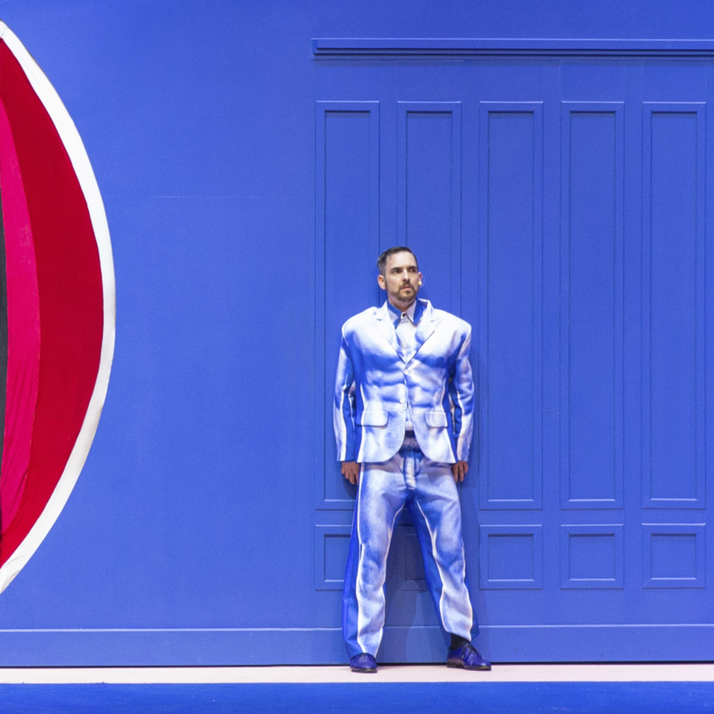 Tallados en rectángulos superpuestos, como los pisos secretos del despacho del director en El público que Marta Pazos pinta de un azul abisal, los tres niveles de estos pendientes ofrecen una puerta abierta al teatro imposible de Lorca: el primero encierra la máscara, el segundo la piel, el último el deseo que se atreve a mostrarse. Extraídos del cobalto de un expediente sellado en ultramar que domina la escena, su tonalidad exacta remite a esa habitación blava con la que Pazos inicia su pasarela cromática antes de transitar al rojo, al rosa, al verde delirante. Escena a escena, rectángulo sobre rectángulo, su geometría encierra un interrogante profundo: ¿quién es el público cuando la puerta se cierra?